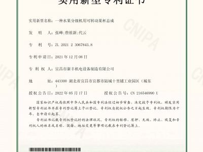 實用新型專利證書《一種水果分級機用可轉動果杯總成》