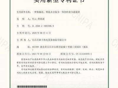 實用新型專利證書《一種集輸送、篩選及分裝為一體的料果分選裝置》